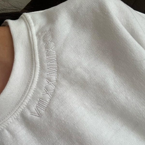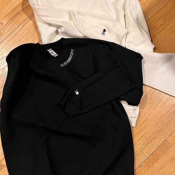 Custom Embroidered Roman Numeral Sweatshirt, Initial On Sleeve, Anniversary Year, Date on Neckline, Valentines Day Gift