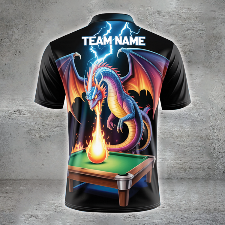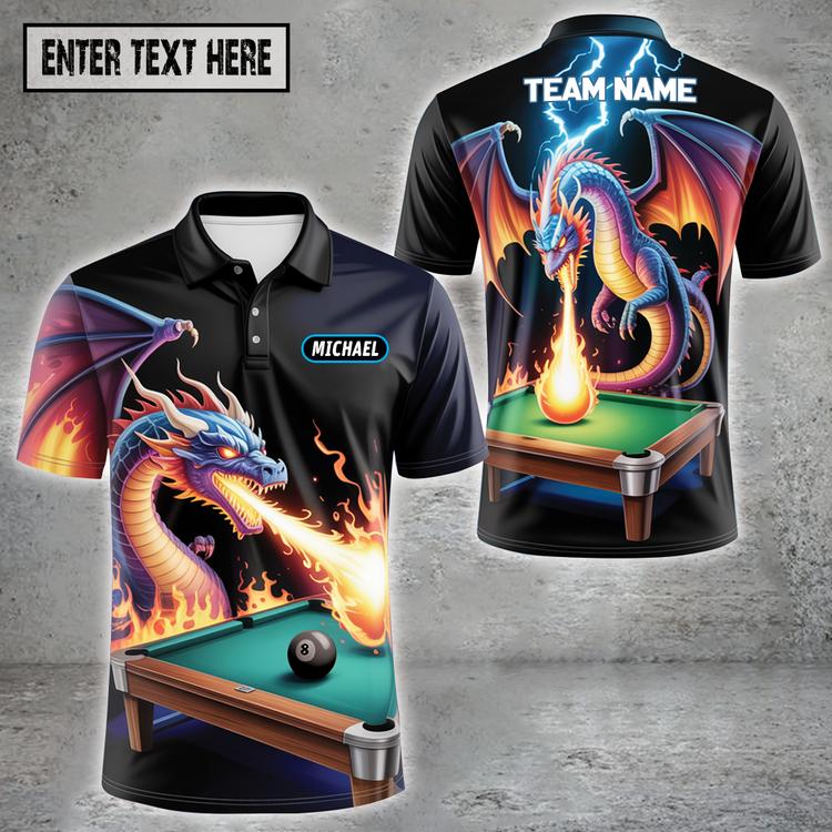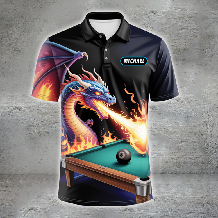 Personalized Dragon Billiards Polo Shirt with Name and Team Custom Text - Fiery Pool Table Design for Pool Players 3D Polo Shirt for Men - Custom Billiard Team League