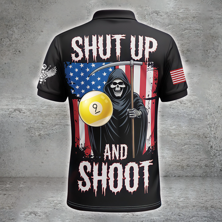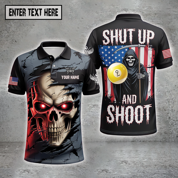 Personalized Shut Up and Shoot Skull Billiards Polo Shirt with Name - Grim Reaper 9 Ball Pool Shirt for American Players Shirt for Men 3D Polo Shirt for Men - Custom Billiard Team League